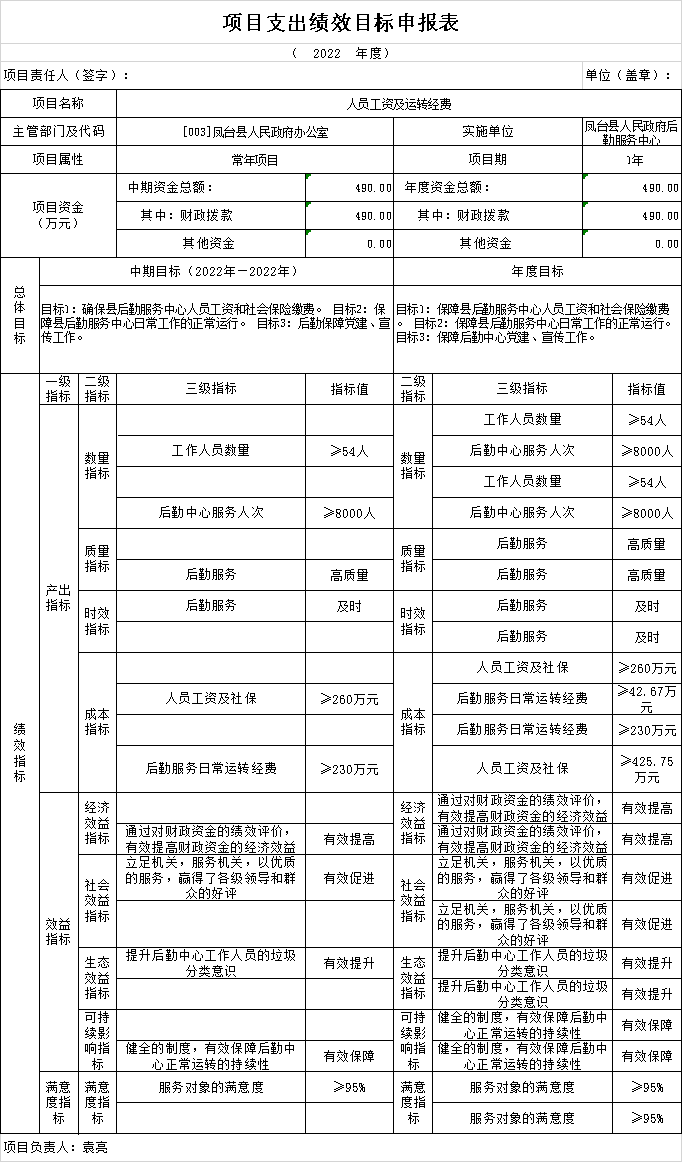 (5)项目内容。确保县后勤服务中心人员工资和社保缴纳;后勤服务中心日常工作的正常运行。