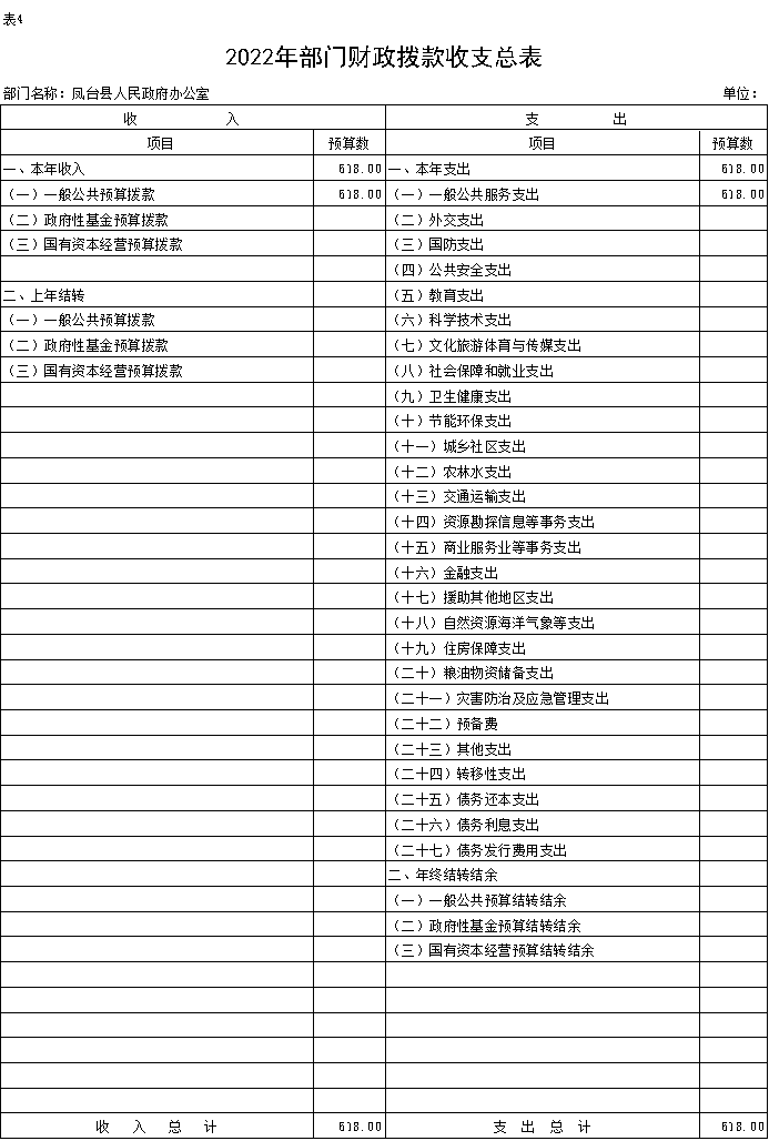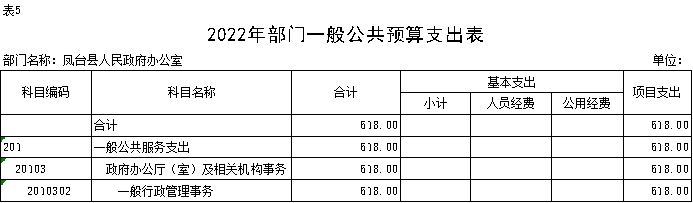 按照综合预算的原则,凤台县人民政府后勤服务中心所有收入和支出均纳入部门预算管理。凤台县人民政府后勤服务中心2022年收支总预算618万元,收入全部是一般公共预算拨款收入。支出包括:一般公共服务支出618万元。