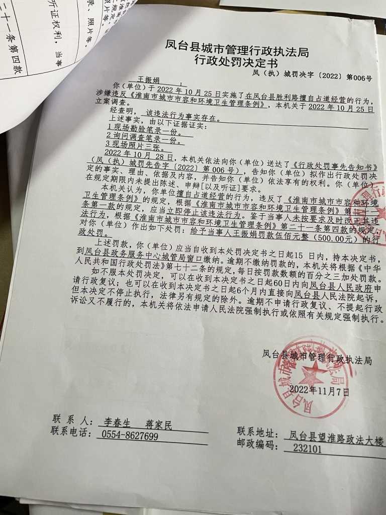凤台县城市管理行政执法局执法处罚决定书