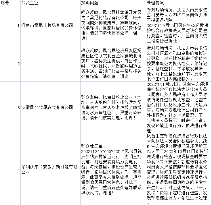凤台县生态环境分局2023年度第四季度重点信访投诉公开