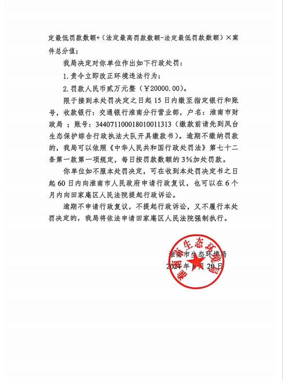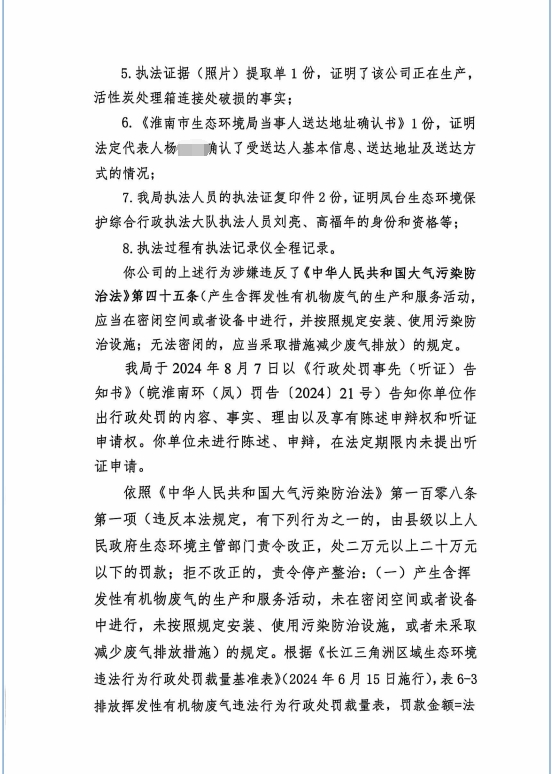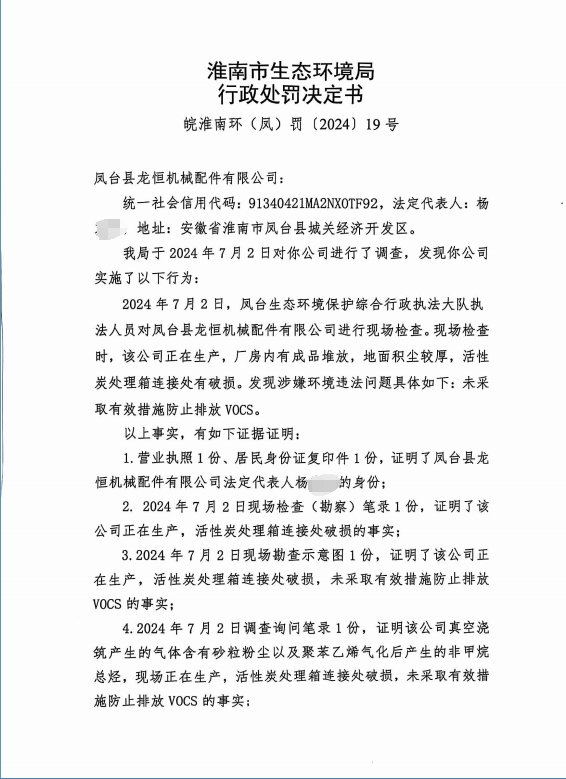 凤台县龙恒机械配件有限公司皖淮南环(凤)罚〔2024〕19号