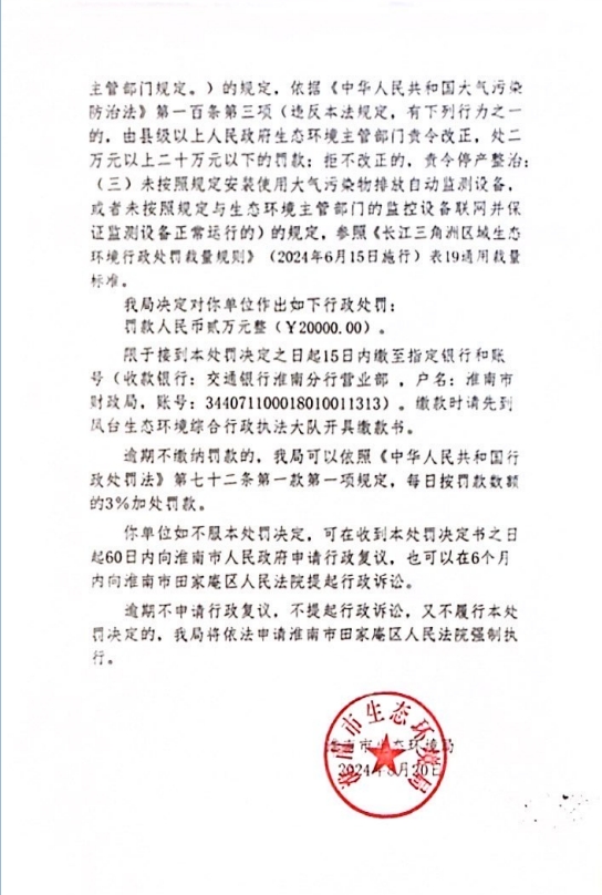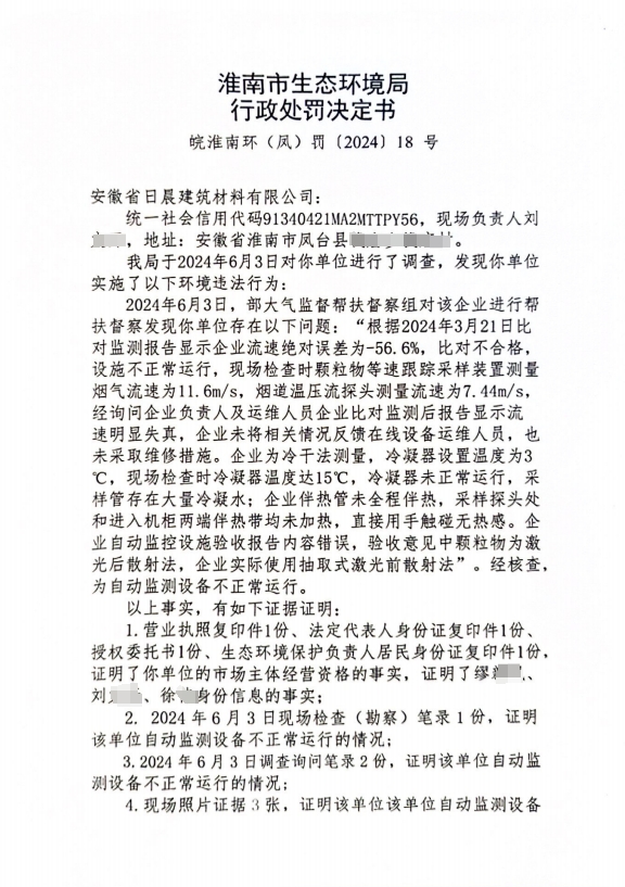 安徽日晨建材有限公司皖淮南环(凤)罚〔2024〕18号