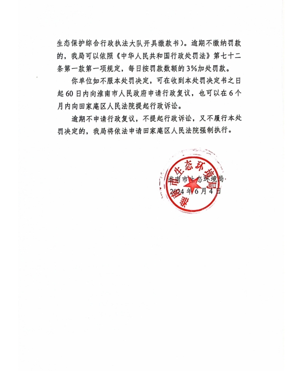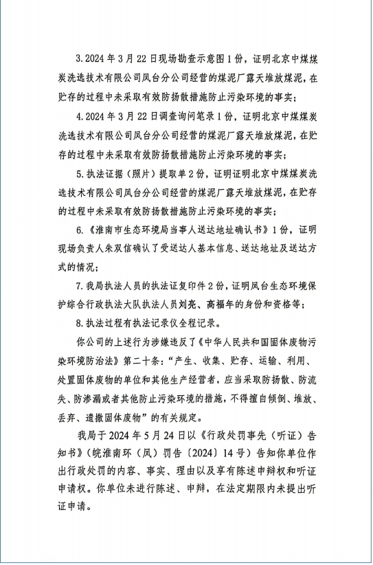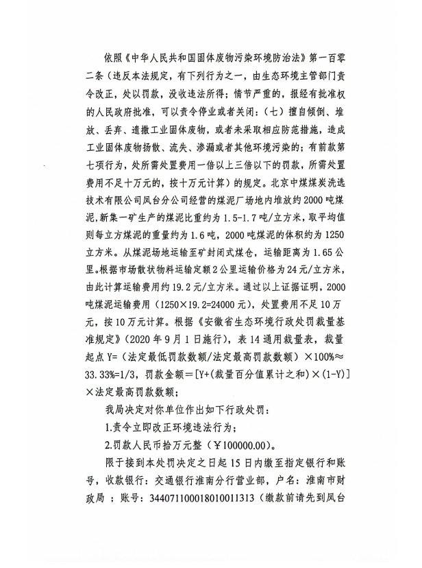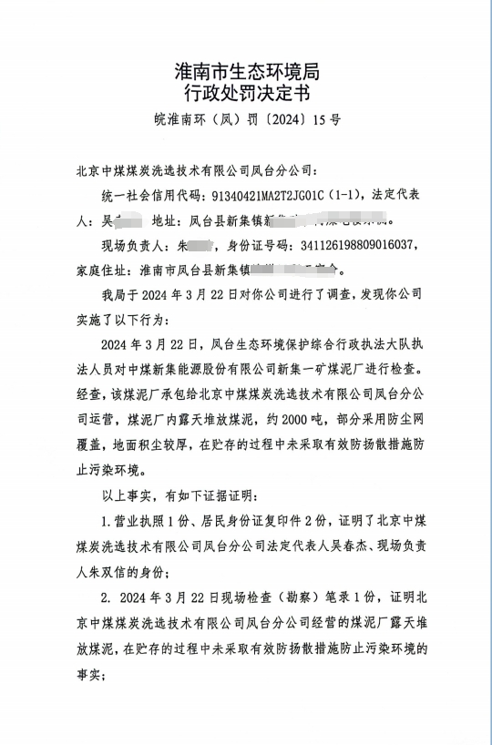 北京中煤煤炭洗选技术有限公司凤台分公司皖淮南环(凤)罚〔2024〕15号
