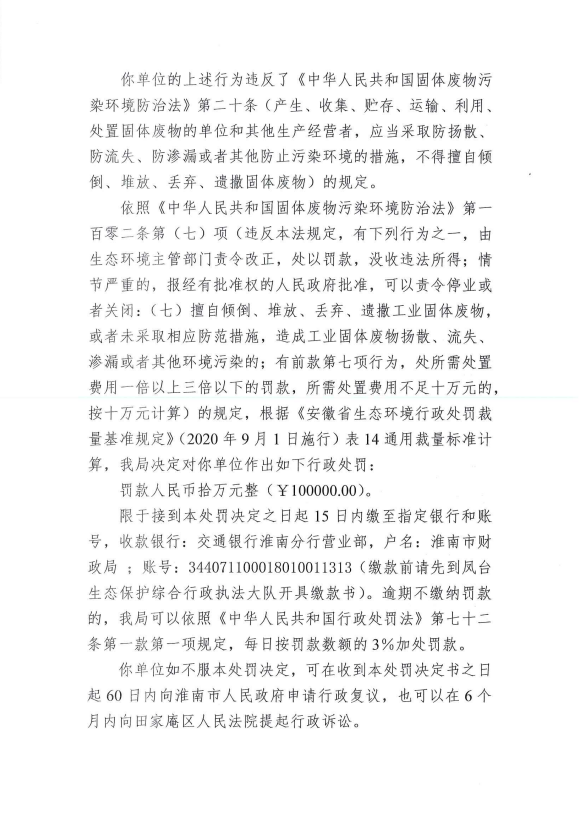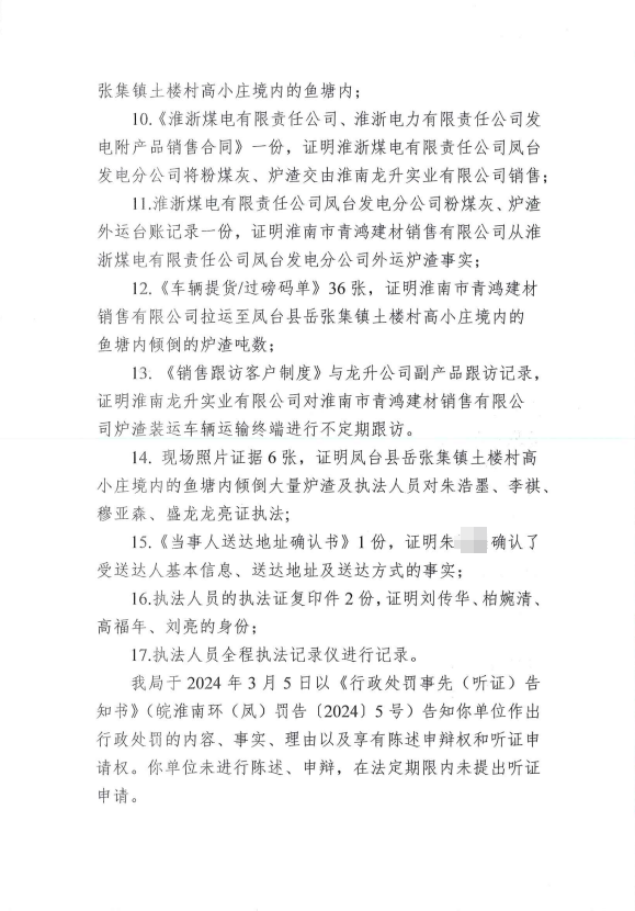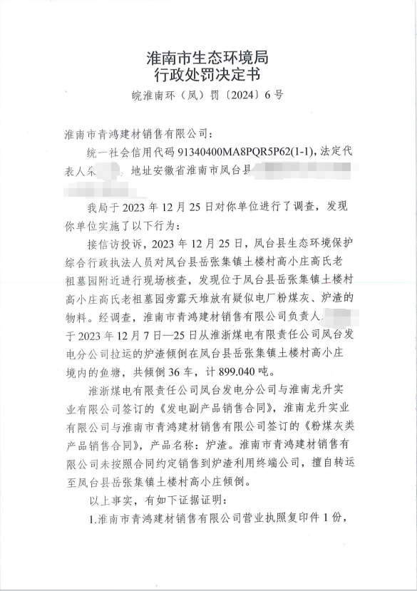 淮南市青鸿建材销售有限公司皖淮南环(凤)罚〔2024〕6号