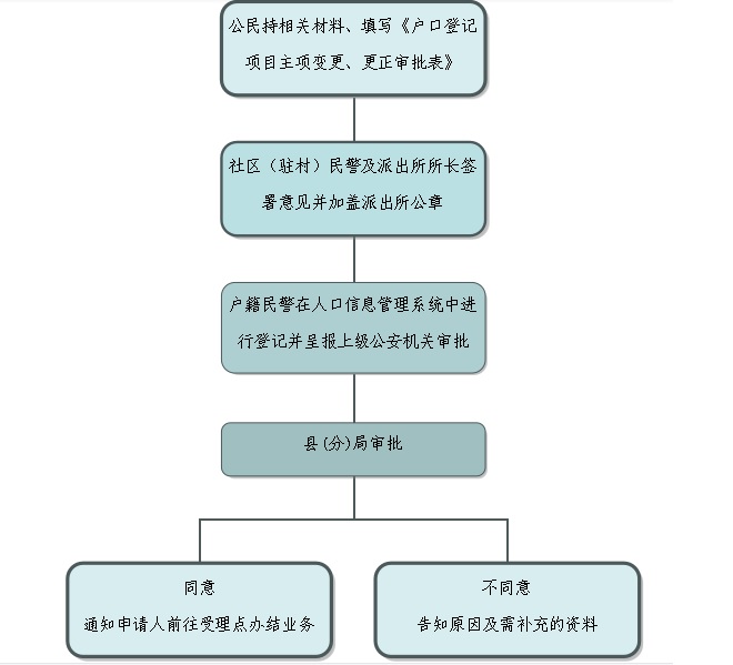(一)公民持相关材料,到户籍地派出所填写《户口登记项目主项变更、更正审批表》,由社区(驻村)民警及派出所所长签署意见并加盖派出所公章后,由户籍民警在人口信息系统进行登记,扫描电子资料后,报分县局审批。