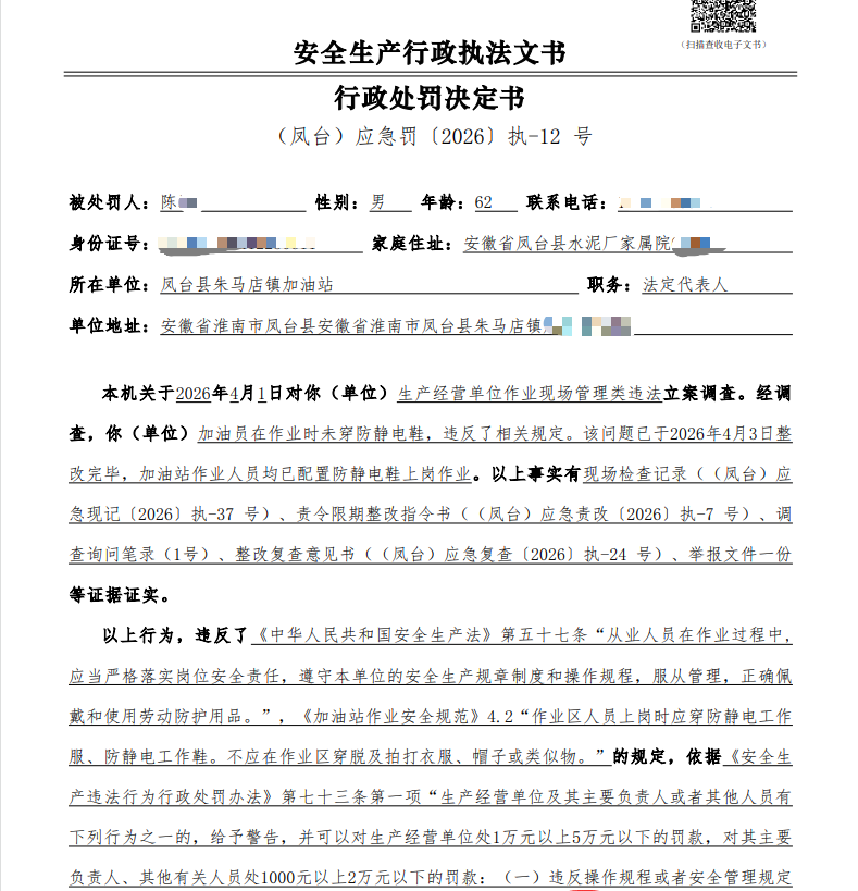 行政处罚决定书(凤台)应急罚〔2026〕执-12号
