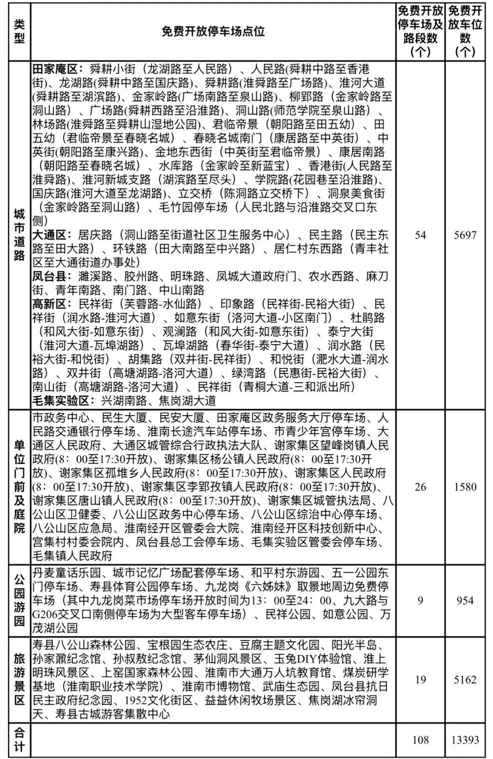 2025年10月1日至2025年10月8日,共8天,淮南市城区108处路段及停车场,共计13393个停车泊位免费向市民和游客开放,其中谢家集区人民政府等6处单位停车场开放时间为8:00-17:30,九龙岗菜市场停车场开放时间为13:00-24:00。