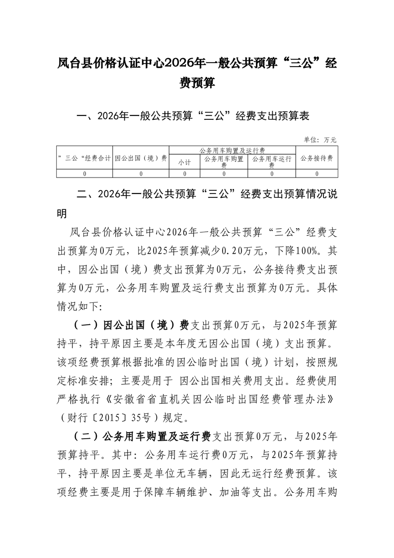 凤台县价格认证中心2026年一般公共预算“三公”经费预算