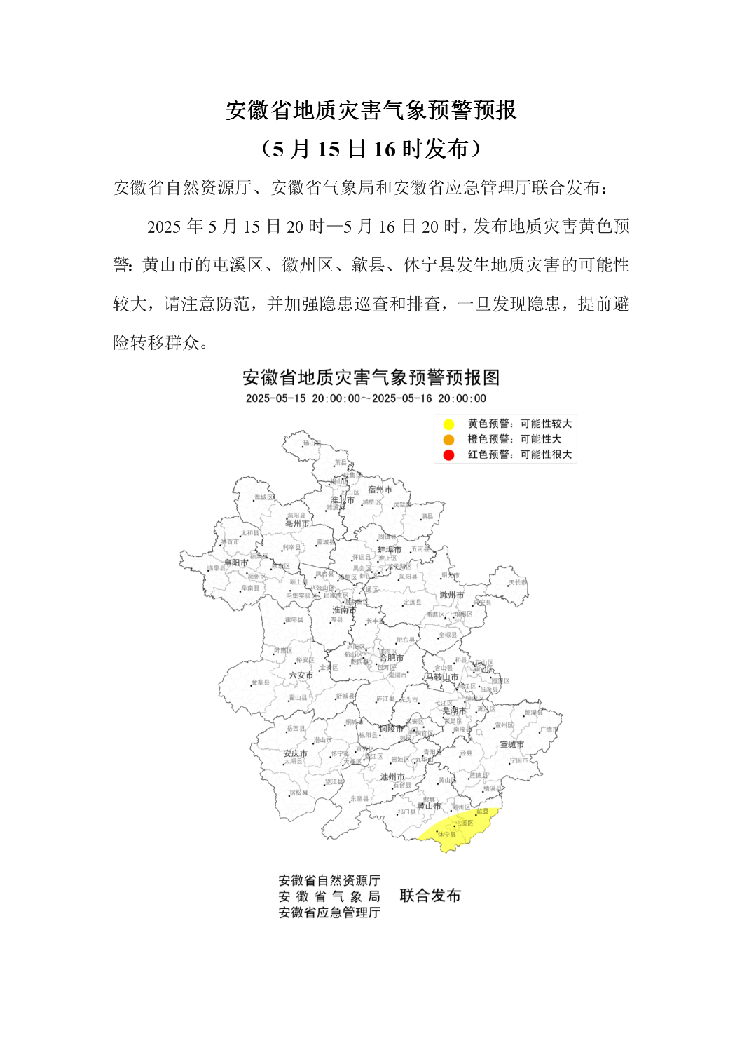 安徽省自然资源厅、安徽省气象局和安徽省应急管理厅联合发布:2025年5月15日20时—5月16日20时,发布地质灾害黄色预警:黄山市的屯溪区、徽州区、歙县、休宁县发生地质灾害的可能性较大,请注意防范,并加强隐患巡查和排查,一旦发现隐患,提前避险转移群众。