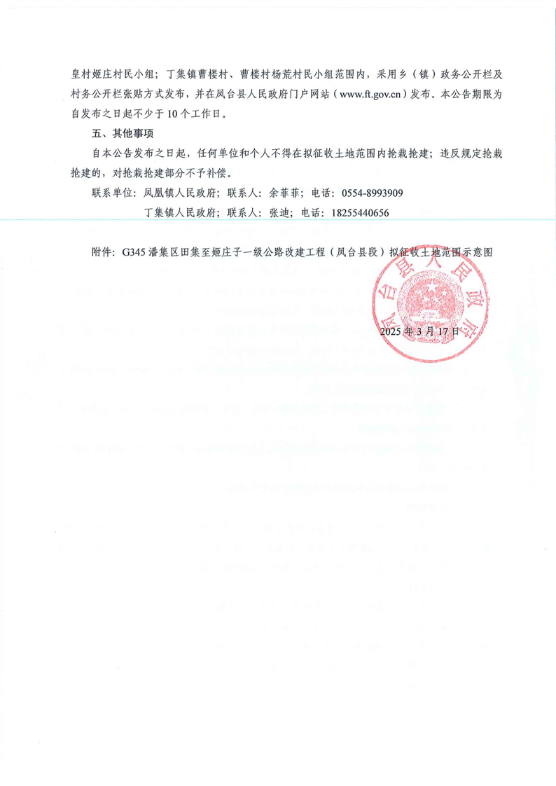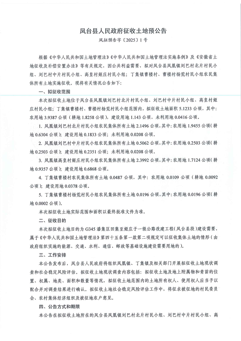 凤台县人民政府征收土地预公告凤征预告字[2025]第1号