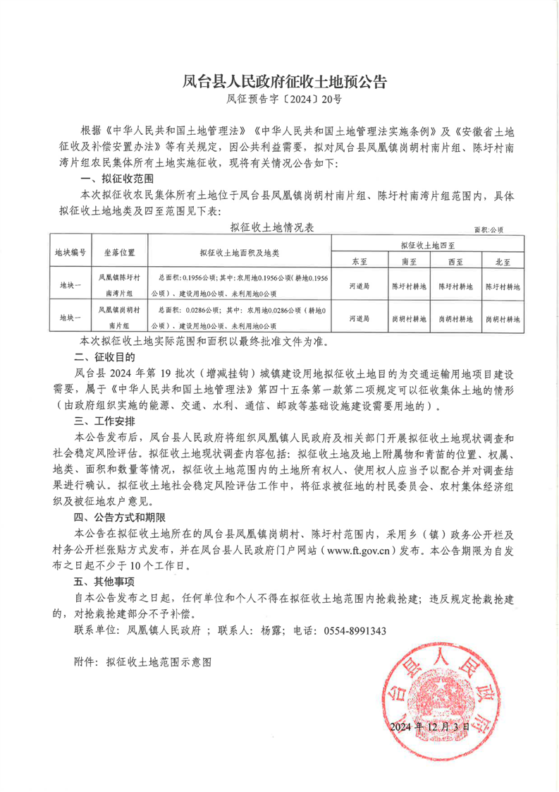 凤台县人民政府征收土地预公告凤征预告字[2024]第20号