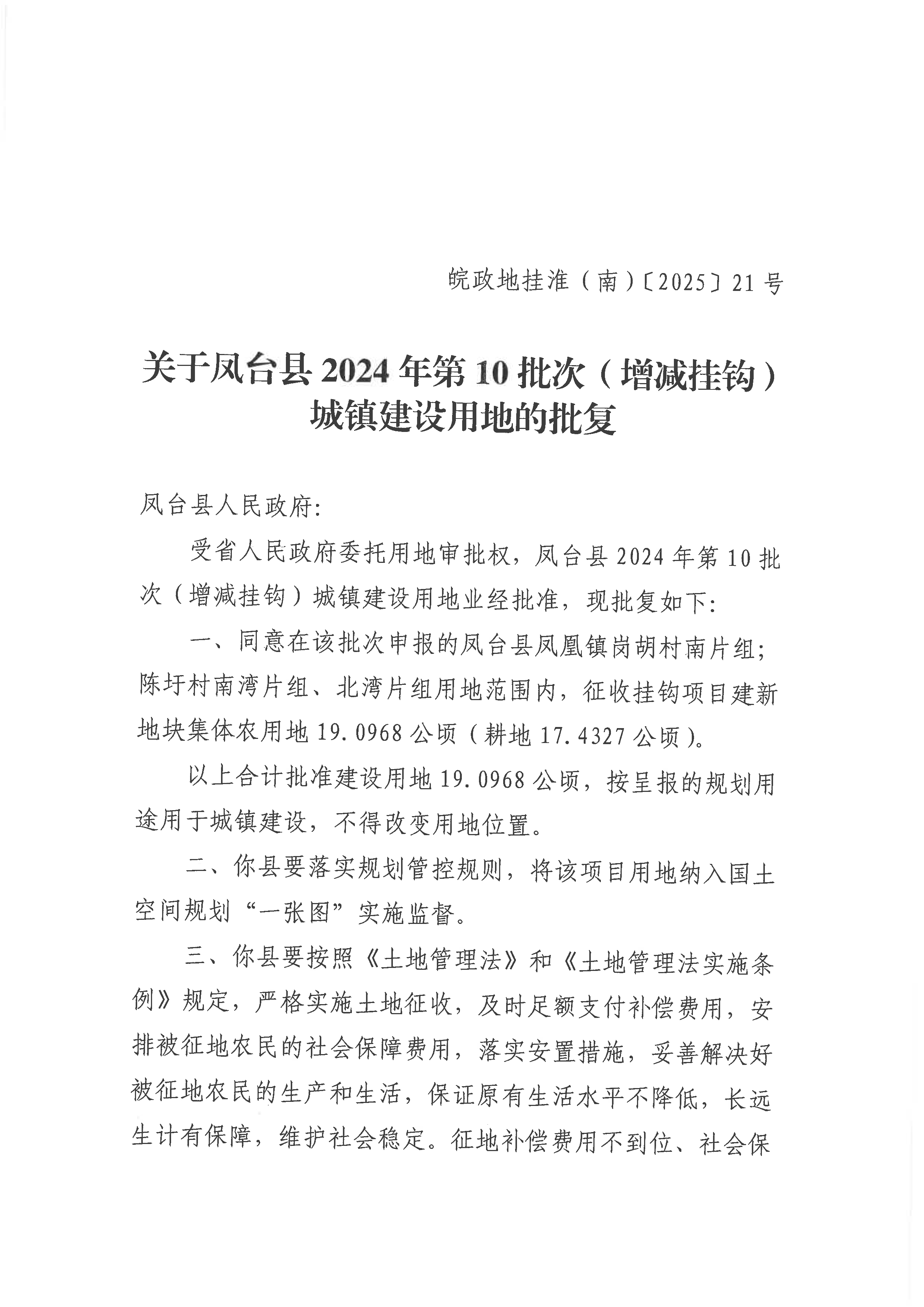 关于凤台县2024年第10批次(增减挂钩)城镇建设用地的批复