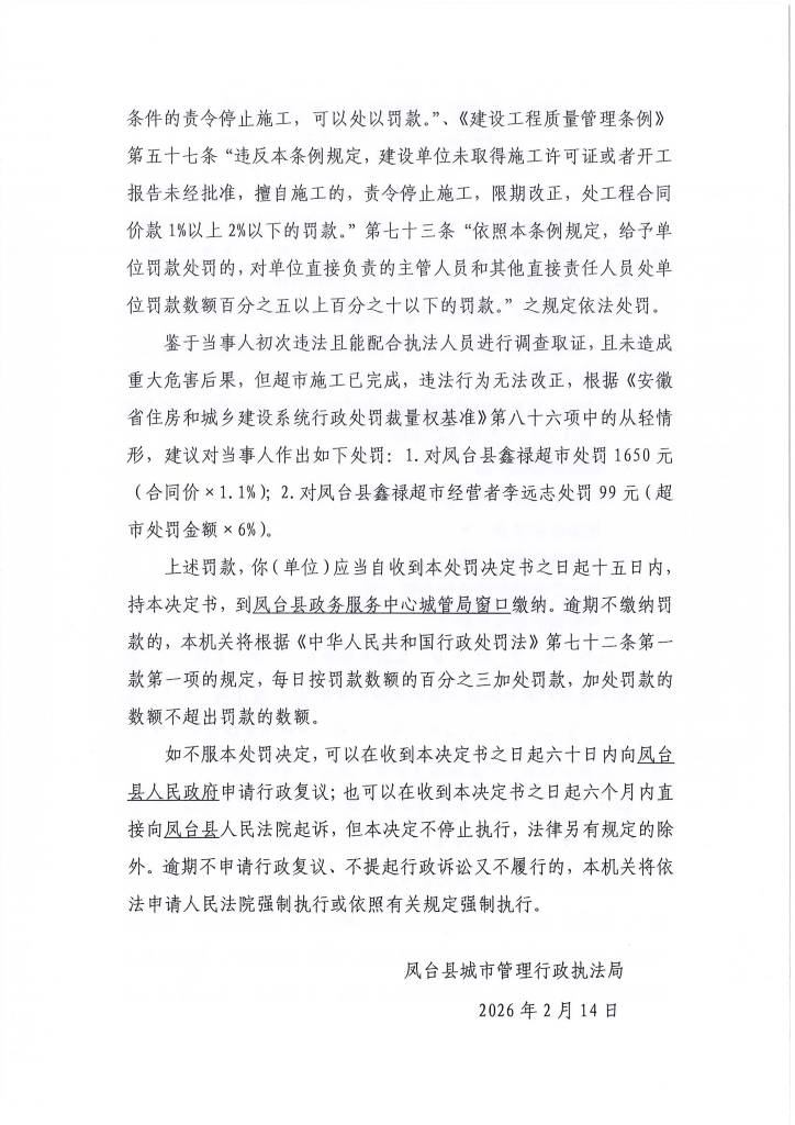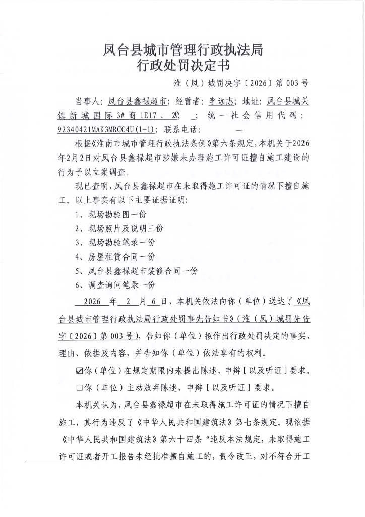 凤台县城市管理行政执法局行政处罚决定书(003号)
