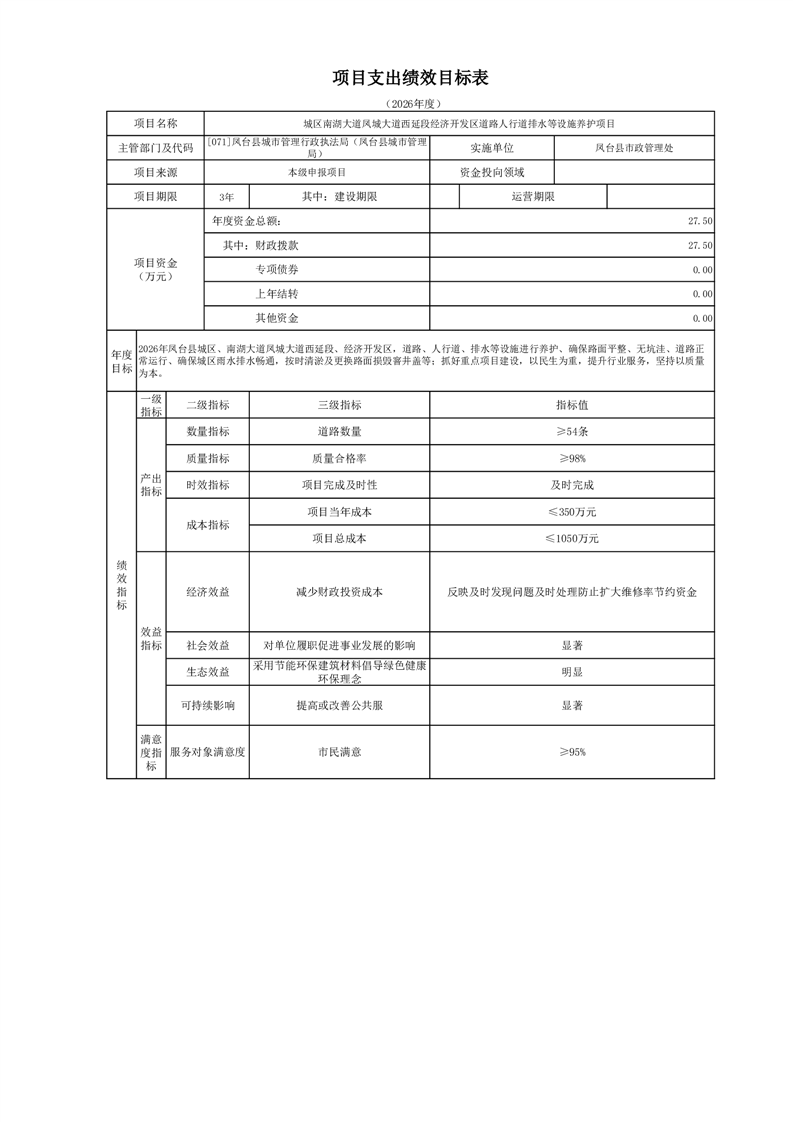 【项目支出绩效自评表】城区南湖大道凤城大道西延段经济开发区道路人行道排水等设施养护项目