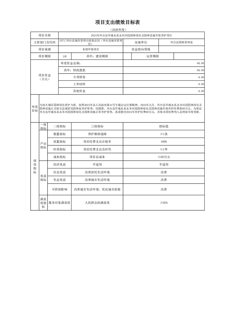 【项目支出绩效自评表】2024年凤台县环城水系永兴河段园林绿化及园林设施年度养护项目