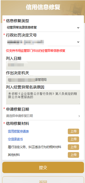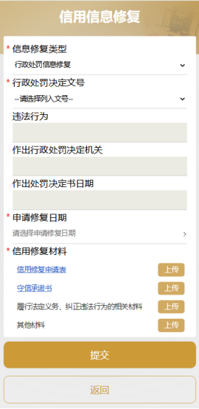 完成系统登录后,系统将自动匹配信用记录,对符合条件的行政处罚、经营异常等信息提供在线申请、材料提交与进度查询一站式服务。修复结果同步至国家企业信用信息公示系统。