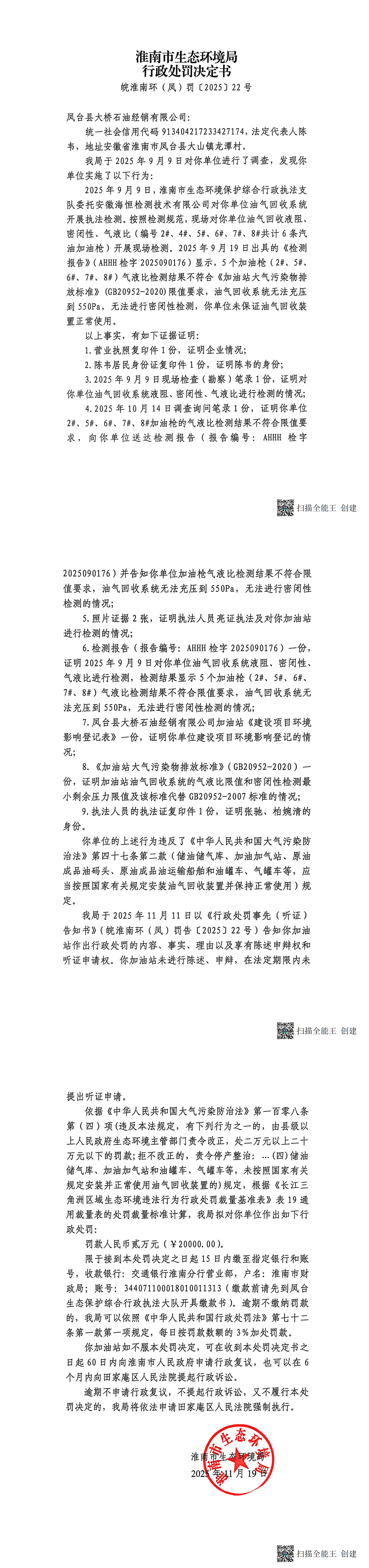 凤台县大桥石油经销有限公司皖淮南环(凤)罚〔2025〕22号