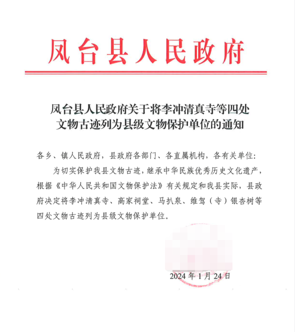 凤台县人民政府关于将李冲清真寺等四处文物古迹列为县级文物保护单位的通知
