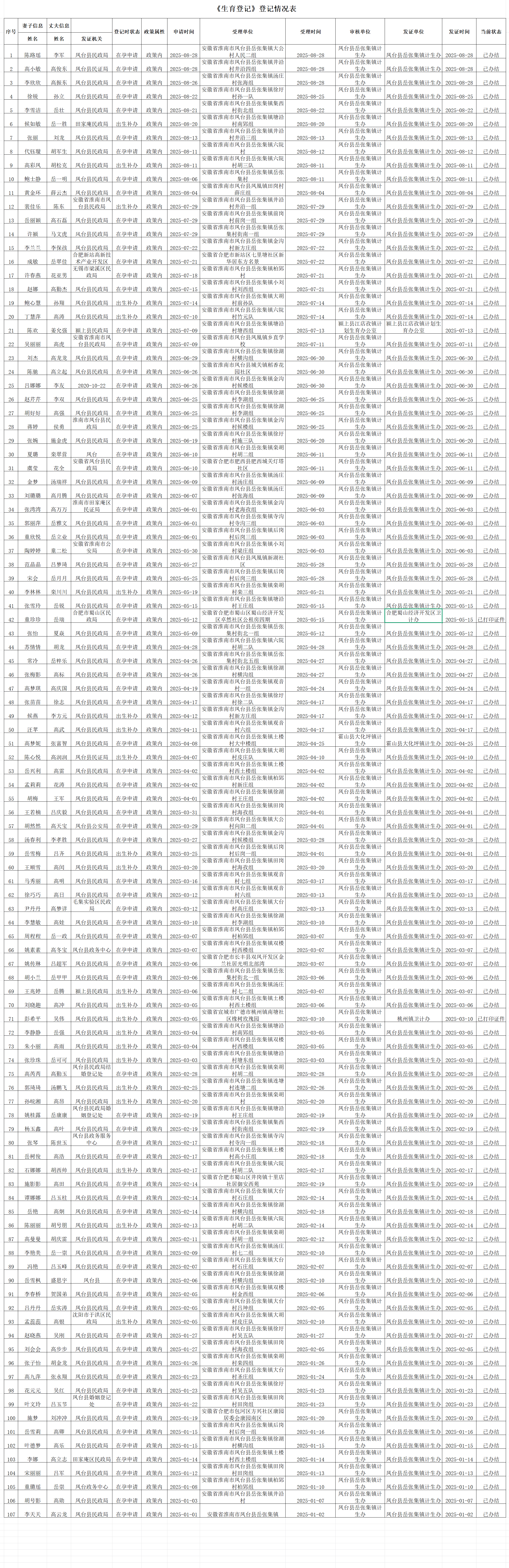 岳张集镇2025年1到8月权力事项办理结果登记表(生育审批登记)