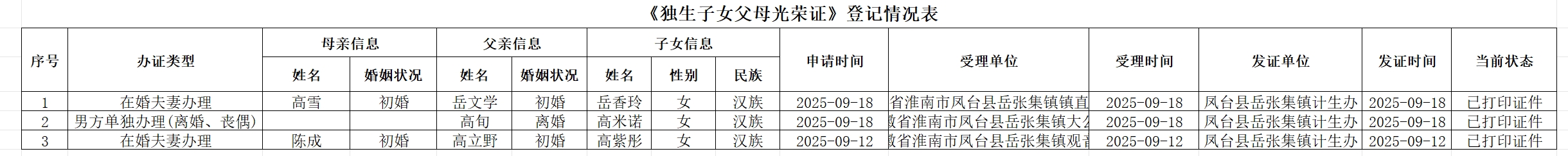 岳张集镇2025年9月权力事项办理结果登记表(独生子女光荣证)