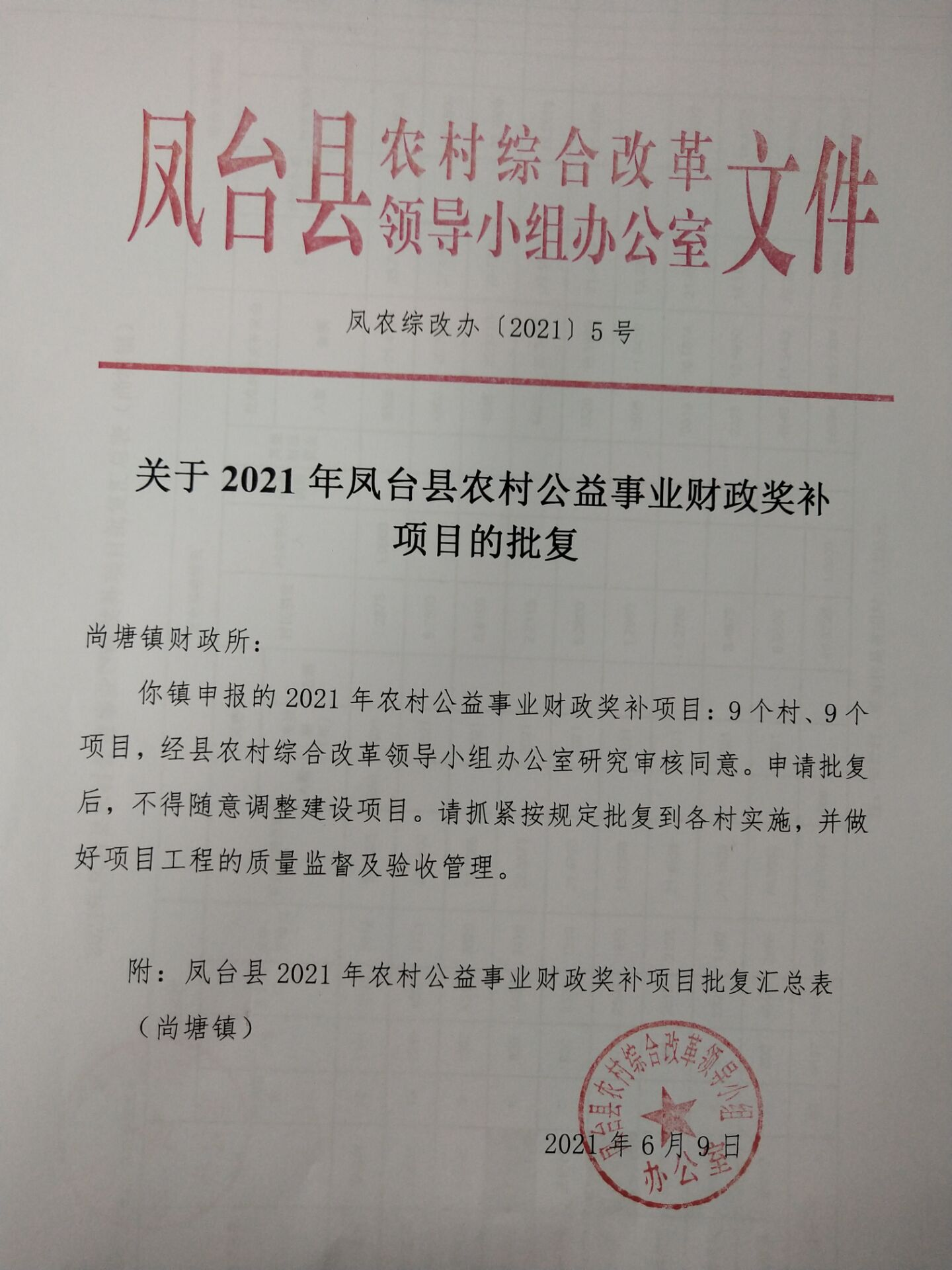 关于2021年凤台县农村公益事业财政奖补项目的批复