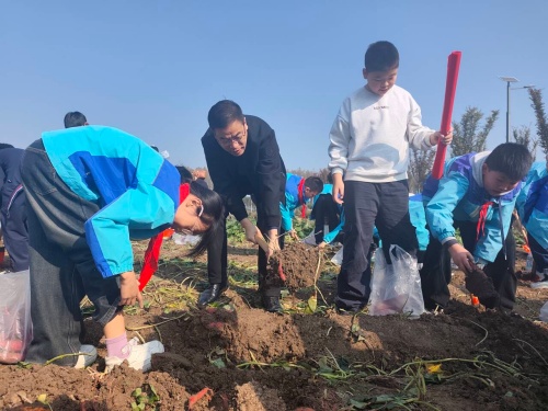 温和的秋风送来了红薯的香甜,红衣黄瓤,藏在泥土里的红薯积蓄着力量,静待收获。在闫湖村薯类种植基地,同学们在农技人员的带领下,分散在各个田垄,扬起锄头,铲开泥土,寻找那一颗颗沉甸甸的红薯。在锻炼动手能力的同时,也让他们体会到了食物的来之不易。