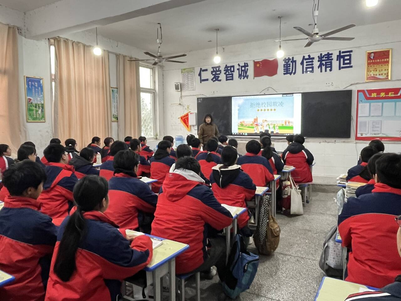 近日,杨村中学各班级以“拒绝校园欺凌 共建和谐校园”为主题,开展形式多样的主题班会活动,切实增强学生法治观念与自我保护意识,为学生健康成长营造安全、和谐、文明的校园氛围。