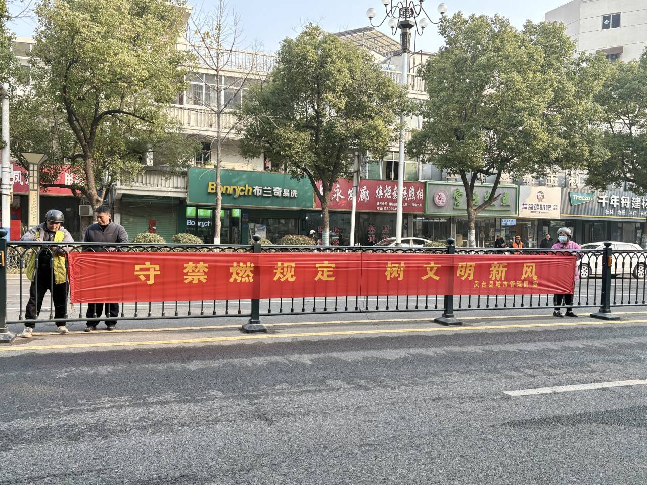 县城市管理局市政管理处组织工作人员在主次干道、社区周边、广场公园等公共场所的醒目位置悬挂、张贴了多条禁燃宣传横幅及标语,以直观醒目的方式提醒广大市民自觉遵守相关规定,树立文明过节新风尚,共同维护公共安全与城市环境。