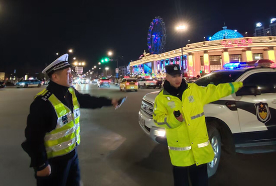 雪情就是命令,防控就是责任。县公安局交管大队迅速调度部署,将警力投向路面一线,重点聚焦环球港大型娱乐游玩活动场所路段,淮河一桥、二桥等易结冰路段,以及G237、G345国道和城区陡坡、涵洞等事故易发区域 ,采取定点值守与动态巡逻相结合的勤务模式,全力消除路面安全隐患。同时,针对部分车辆因路面湿滑出现打滑、抛锚等突发状况,巡逻民辅警上前帮助推车助困、紧急处置,用暖心服务化解群众出行难题。从城区主干道到乡镇连接线,闪烁的警灯与荧光绿身影交织成夜空中最安心的风景线,全程守护跨年夜群众出行路。