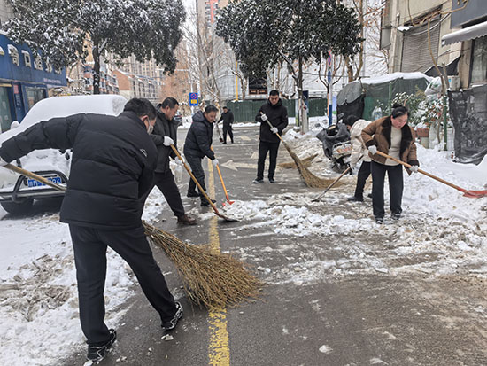 清扫现场,工作人员自带铁锹、扫帚等工具,分工协作、默契配合,不畏严寒奋力铲除积雪、清扫路面。经过共同奋战,责任区域内的积雪被及时清除,为市民通行开辟了安全畅通的“暖心路”。