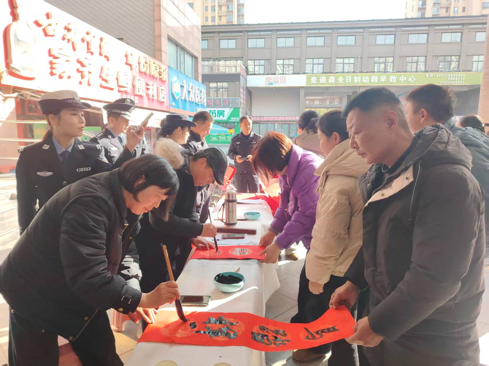 在福海园小区商业街,来自寿县和凤台县公安局有关警种的五名书法家挥毫泼墨,现场为围观群众书写包含“平安、祥和、祝福”的春联150余副和“福”字五十余个,部分民警辅警还现场进行了防诈骗等安全防范知识讲解,在祝福社区群众平安迎新年的同时,提醒大家要牢记安全知识,守护好自己的“钱袋子”。