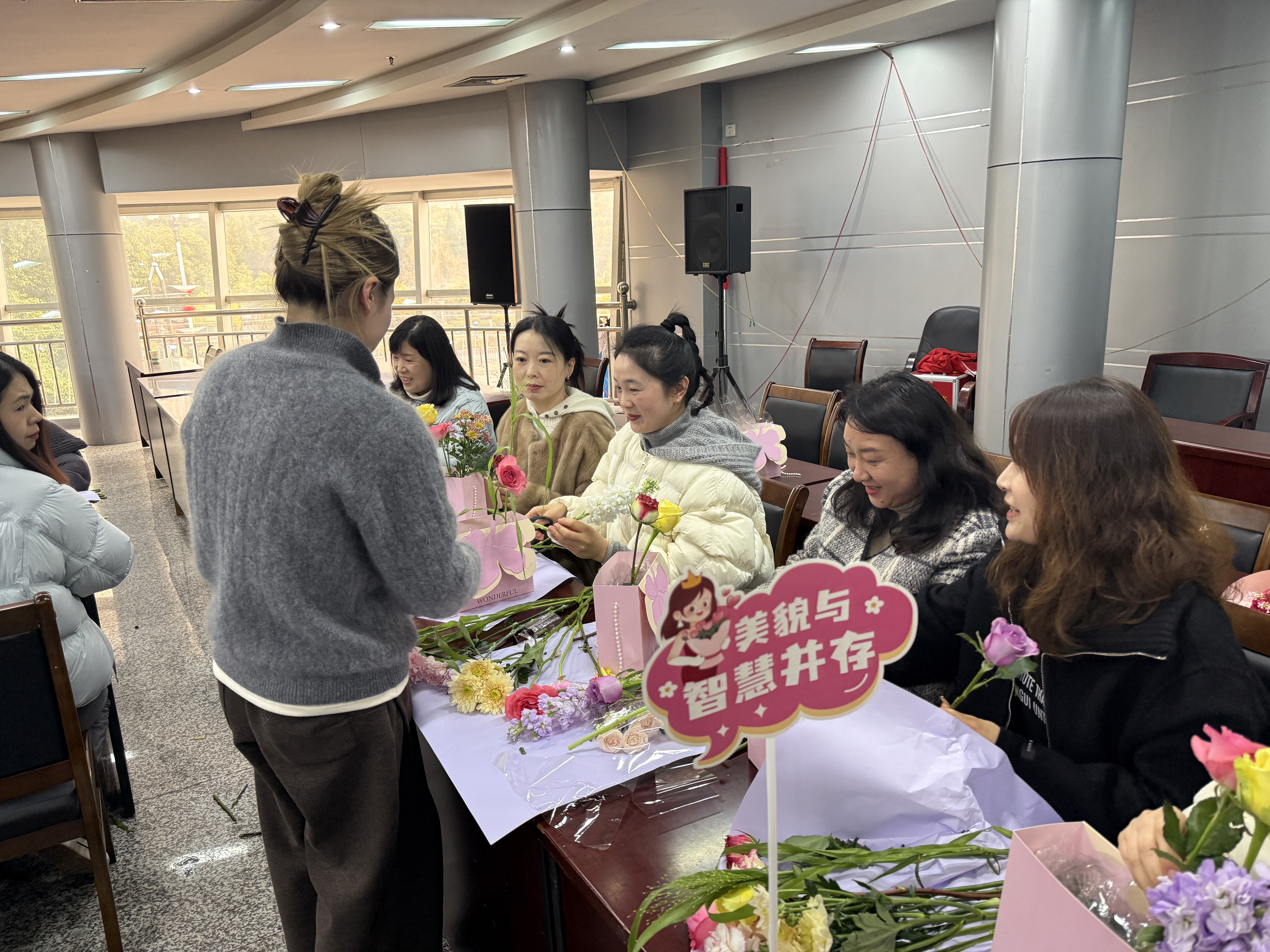 活动现场,花艺师现场讲解花材知识、色彩搭配、修剪技巧与造型构图,并细致示范、耐心指导。女职工们认真学习、动手实践,在一剪一插间,将玫瑰、洋桔梗、尤加利叶等花材精心搭配,制作出一件件错落有致、生机盎然的花艺作品。