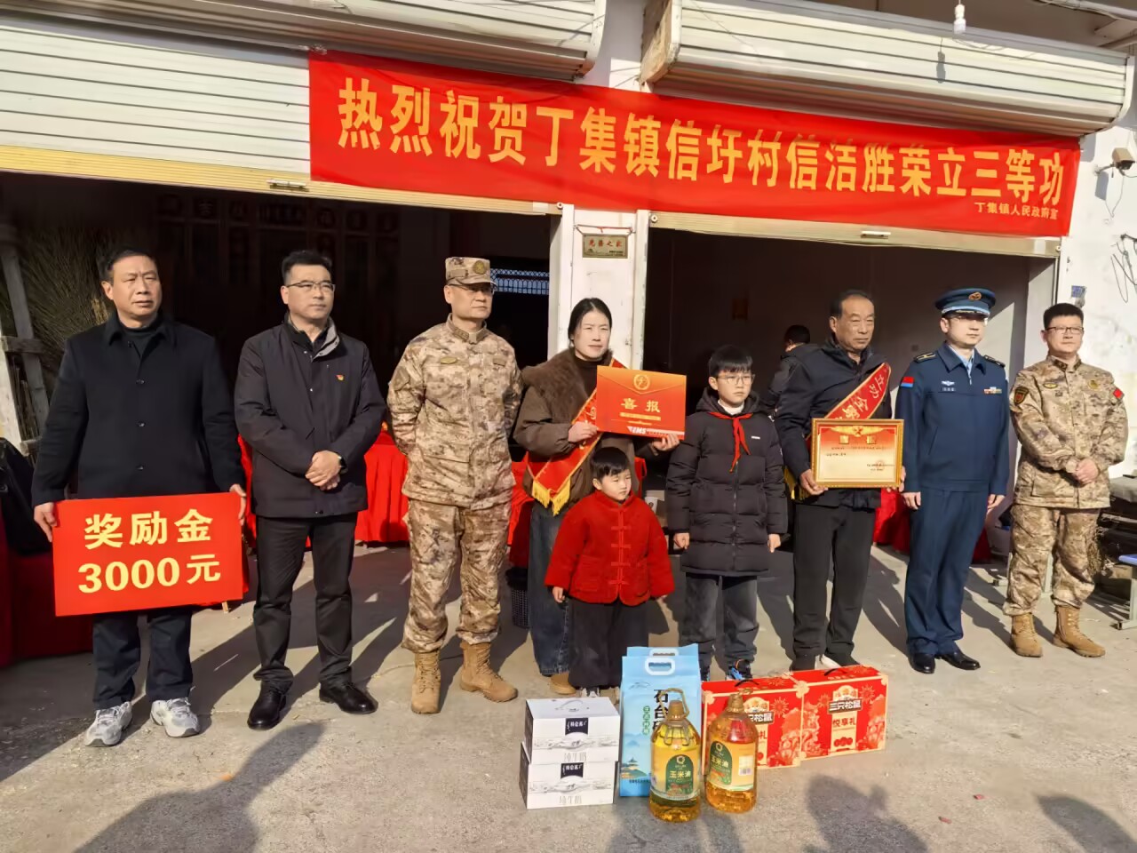 1月8日,县委常委、县人武部政委李冰及县退役军人事务局有关负责人、现役军人信洁胜所在部队领导一行前往丁集镇信圩村,为在部队荣立三等功的现役军人信洁胜的家属送去立功喜报和慰问金,以表达对军属的关怀问候和崇高敬意。