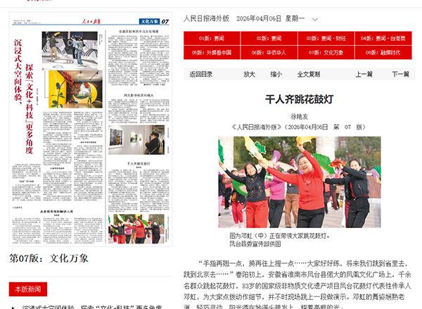 4月6日,《人民日报》在其海外版“文化万象”版以《千人齐跳花鼓灯》为题,图文报道今春以来安徽省淮南市凤台县开展弘扬非遗文化花鼓灯艺术全民健身活动。全文如下: