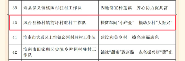 近日,全省第九批选派村百个发展典型案例名单公布。其中,凤台县杨村镇前圩村驻村工作队《扶贫车间“小产业” 撬动乡村“大振兴”》入选。