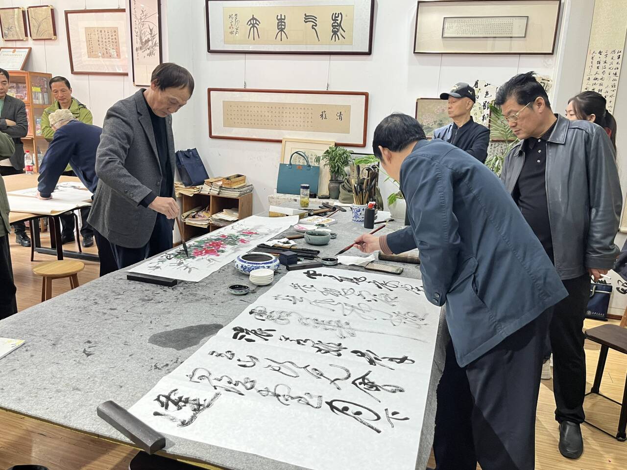 仪式现场,红色揭牌绸布下的“凤凰书法院”牌匾格外醒目,浓厚的文化氛围扑面而来。县文联负责人表示,凤凰书法院的成立是我县文化事业繁荣发展的一个生动缩影。揭牌仪式后,嘉宾与书法爱好者移步书法院创作区,即兴挥毫献作,引得参观者不时驻足欣赏、交流点评。