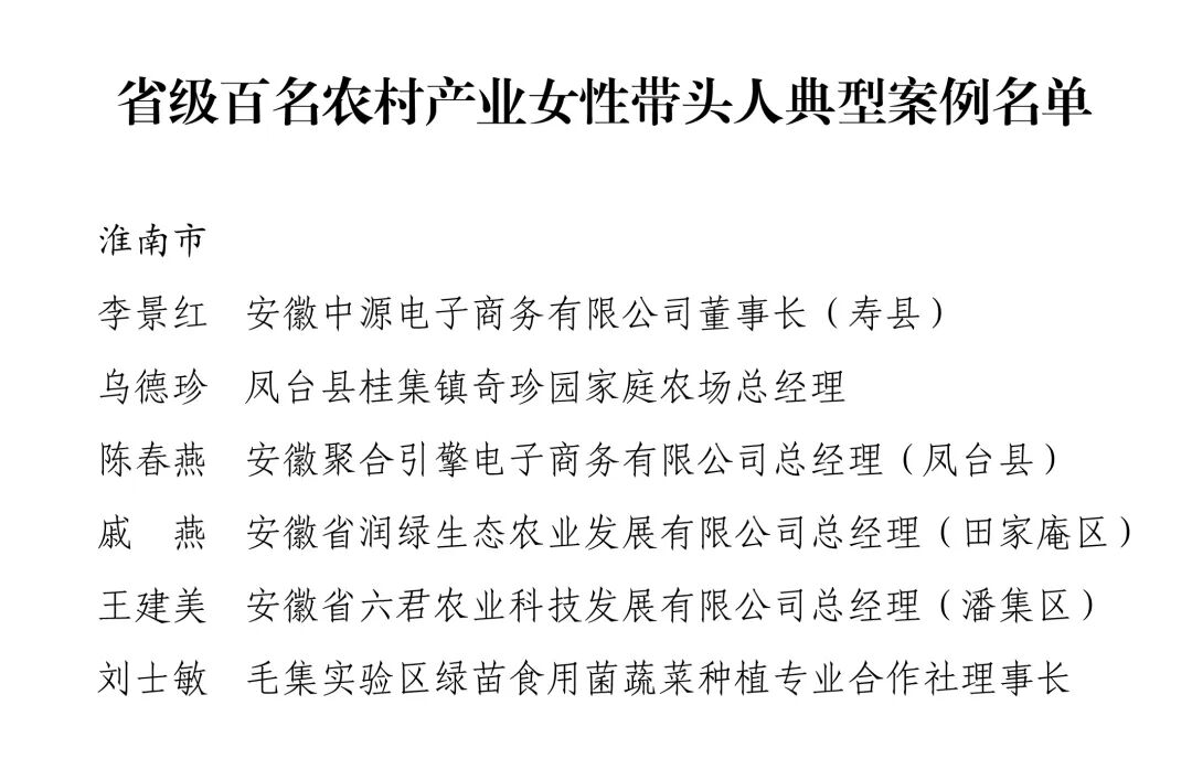 她们分别是:凤台县大兴镇闫湖村的李蕾入选省级百户“美丽庭院”典型案例,凤台县桂集镇奇珍园家庭农场总经理乌德珍、安徽聚合引擎电子商务有限公司总经理陈春燕入选省级百名农村产业女性带头人典型案例。