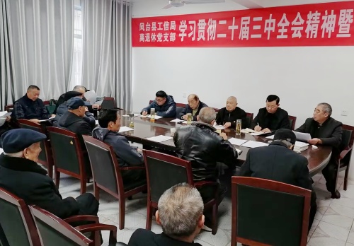 12月1日,凤台县工信局离退休党支部学习贯彻党的二十届三中全会精神专题党课在县新研会会议室开展。县工信局、龙潭社区负责人参加。 党课紧紧围绕党的二十届三中全会重大意义、主要内容和核心要义等进行了深度解读。与会老干部们还共同学习了《中共中央关于进一步全面深化改革、推进中国式现代化的决定》和全县离退休干部党组织书记培训班暨离退休干部党建工作推进会精神。 通过学习,大家纷纷表示,要自觉贯彻好宣传好落实好全会精神,持续发挥余热,为推动凤台县工信事业高质量发展贡献力量。