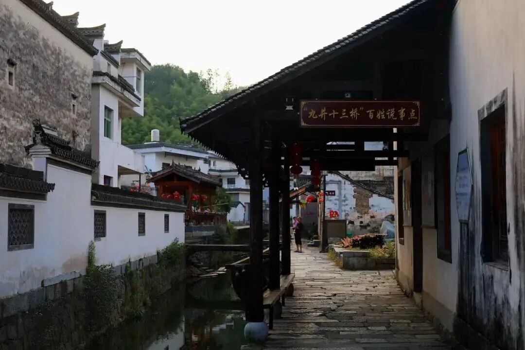 在皖南这座古村,一条清澈的竹溪河缓缓流过,河上横跨着13座古朴石桥,河中及两岸分布着9口古井。典故“井水不犯河水”与这里密切相关,“九井十三桥”景观是这一典故的实物见证。